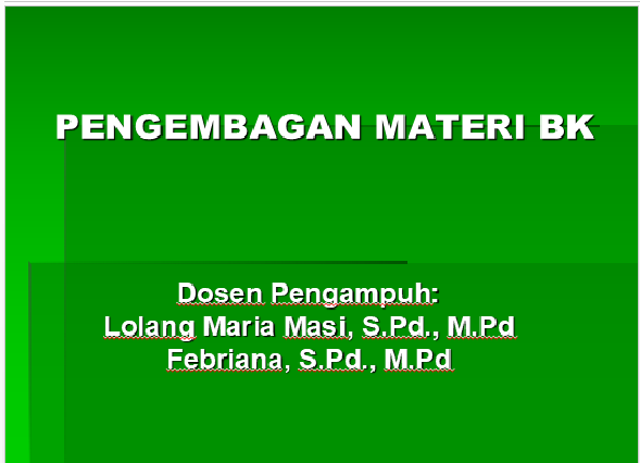 Mata Kuliah Pengembangan Materi BK merupakan mata kuliah wajib di Program Studi Bimbingan dan Konseling, FKIP, Universitas Nusa Cendana. Kode Mata Kuliah KPBK 45247. Beban mata kuliah sebesar 2 SKS. Dosen pengampu mata kuliah (Kelas A & B) : Lolang Maria Masi, S.Pd., M.Pd dan Febriana S.Pd., M.Pd
